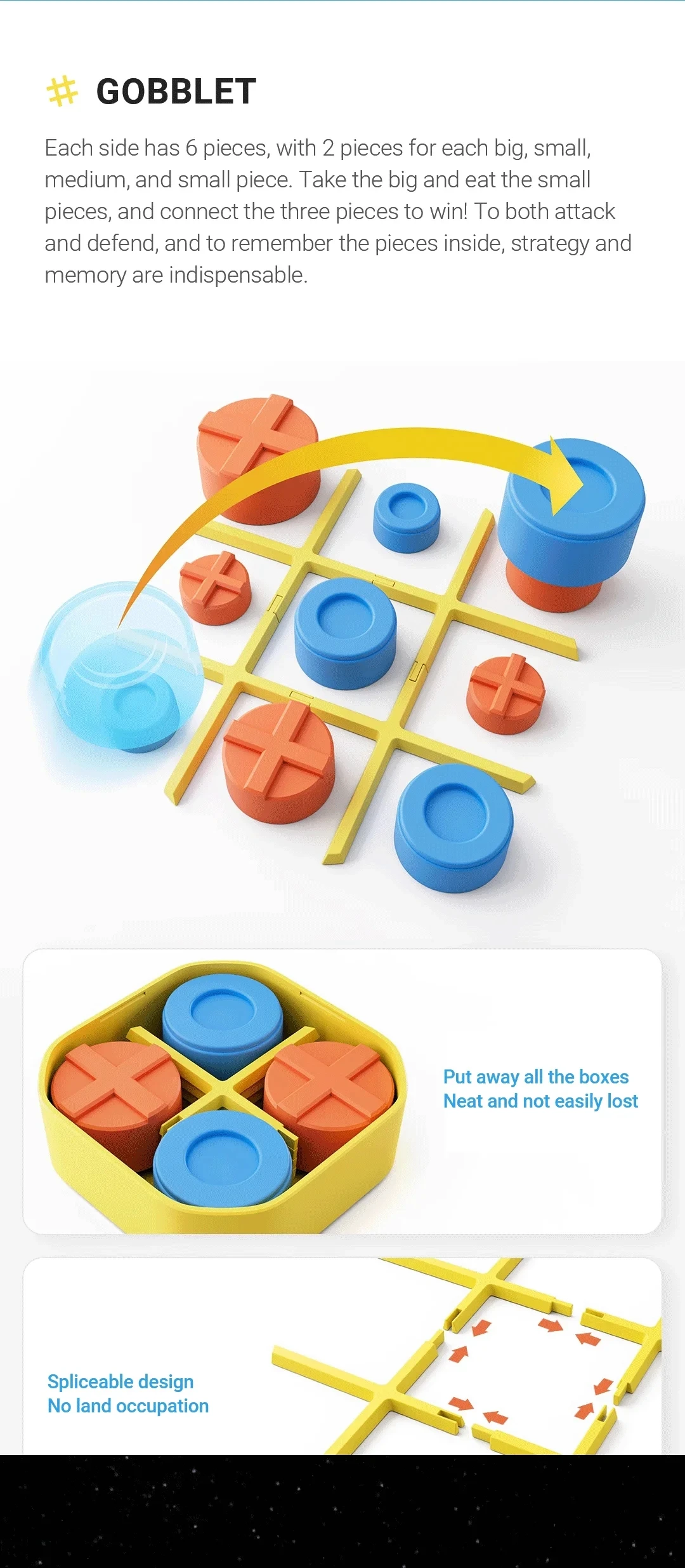 Minden darab három méretben kapható, és minden körben elhelyezhet vagy mozgathat egy darabot. A nagyobb darabok lefedhetik a kisebbeket – csatlakoztasson három színt a nyeréshez! Ez a stratégiai társasjáték tökéletes a kritikai gondolkodás és érvelési készségek gyakorlására.